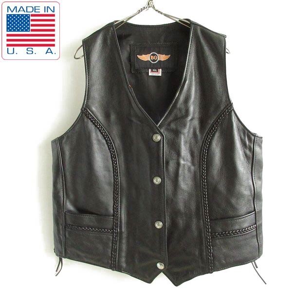 > 美品 USA製 BG バイカー レザーベスト 黒 レディースXXL メンズS-M程度 コインボタン アメリカ製 D146-05-0002ZV