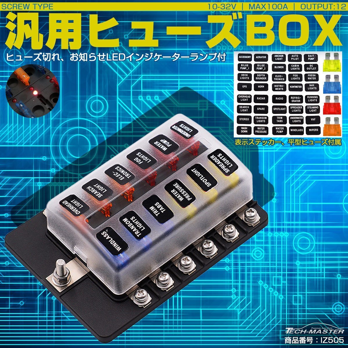 - 平型ヒューズ用 ヒューズボックス 12極タイプ DC12V/24V兼用 MAX100A IZ505