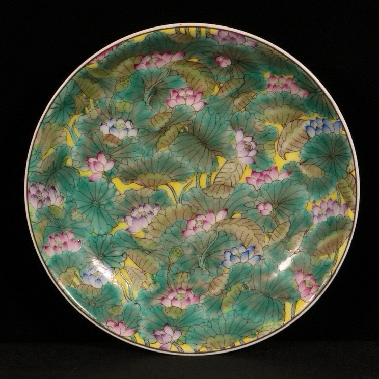 - 旧 清雍正 粉彩 荷花図 観賞皿 唐磁 古陶磁器 陶芸 中国古美術 古賞物 古置物 唐物 S79