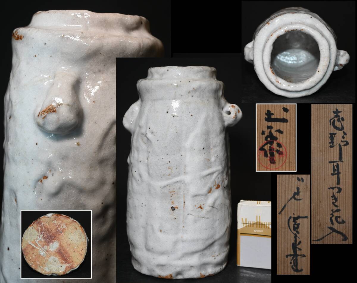 > 真贋保証■坪島土平 作■ 志野耳付花入 共箱 師:川喜田半泥子 康永窯 高約27cm 花器 花瓶 花生 茶道具