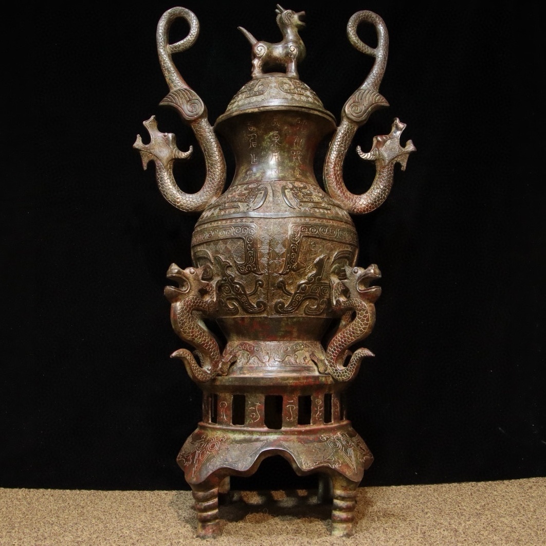 - 秘藏 青銅器 商周時代 青銅―双龍罍(銘文)古置物 供養品 食器 炊具 鬲鼎 さお盆 銅製品 銅器 極細工 中国古玩 骨董品 唐物 古美味 9.2.90