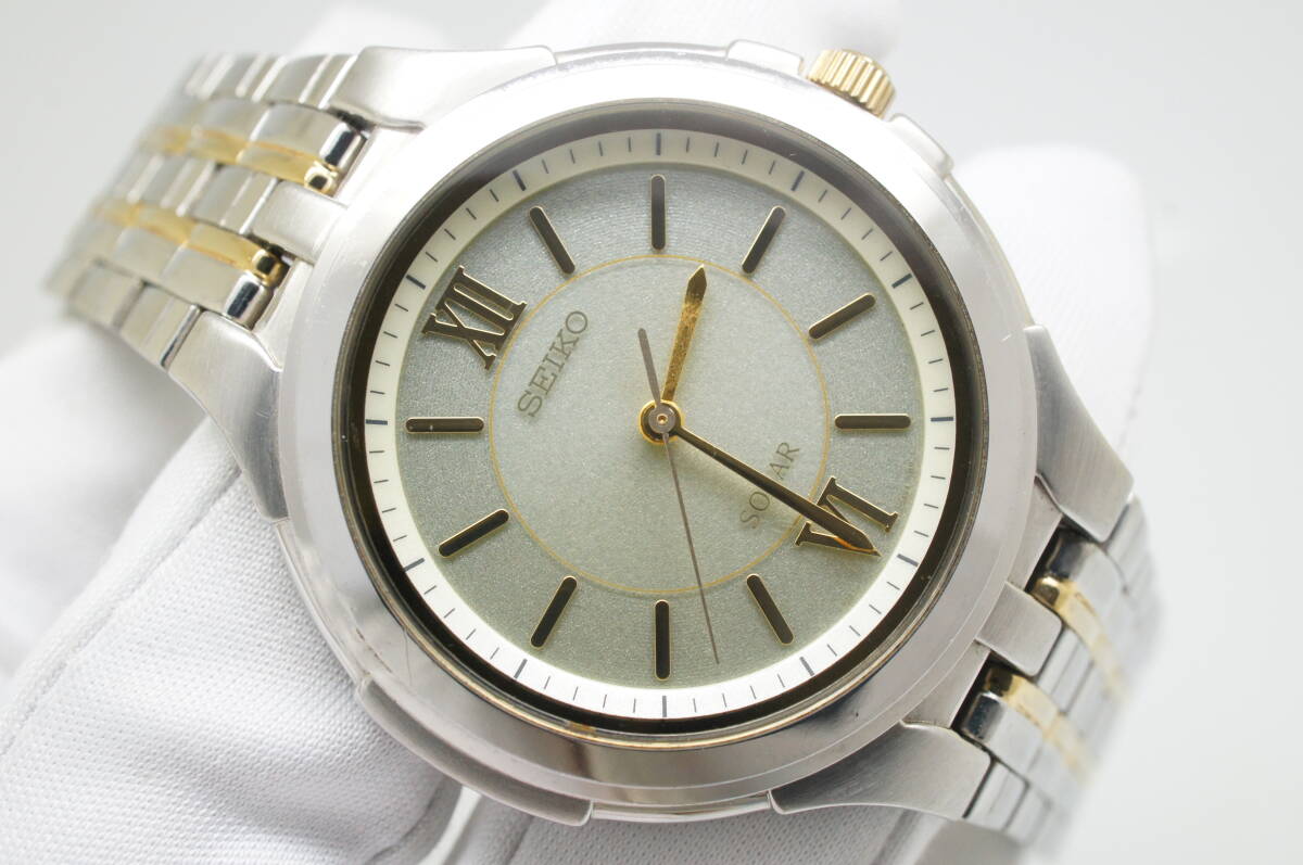 - Z23●作動良好 SEIKO セイコー SOLAR ソーラー V181-0AK0 金文字盤 ラウンドケース型 メンズ腕時計 コンビ お洒落 クォーツ