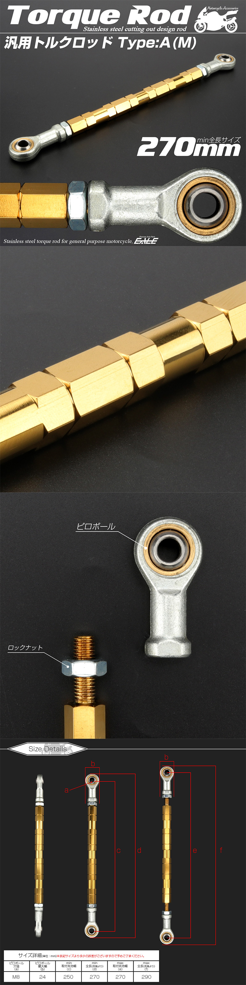 > 汎用 ブレーキ トルクロッド Mサイズ 取付幅250-270mm カラー ゴールド タイプA ターンバックル ピロボール TH0062