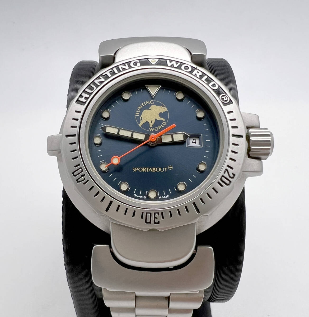 - 美品 稼働 新品電池 HUNTING WORLD ハンティングワールド SPORTABOUT クォーツ 文字盤ネイビー シルバー デイト SS レディース腕時計