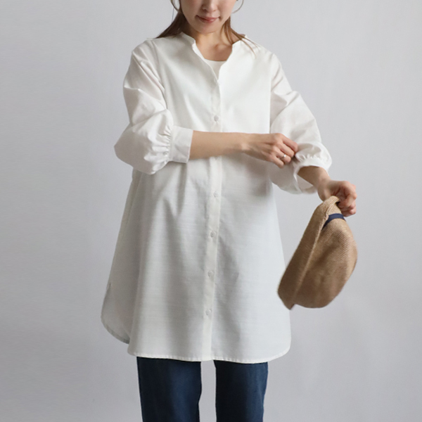 > 秋支度SALE 上質ギマ擬麻コットン ゆったり ヘム ラウンド 裾 ロング シャツ 前開き 羽織り ホワイト R15B