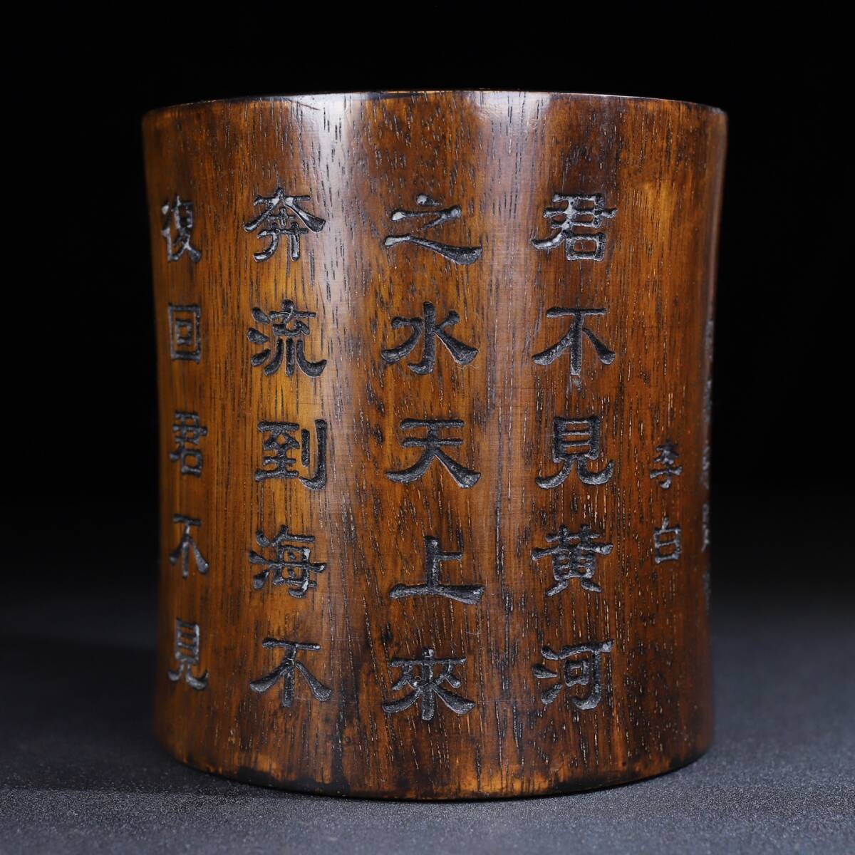 - 旧蔵 大清 乾隆五十五年内務府監製 花梨木 彫刻 詞作『将進酒・君不見』丸筆筒 筆道具 文房具 木製 極細工 中国古玩 骨董品 古美味 209
