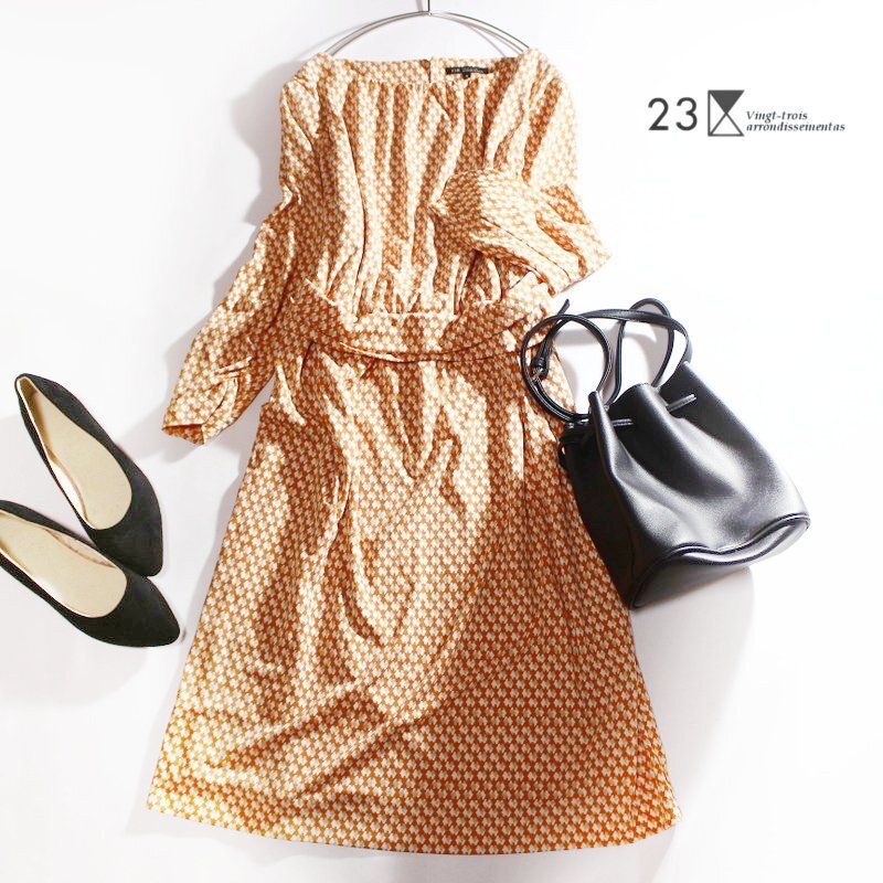 - 美品 23区 株) オンワード樫山 さらり 夏 レトロ 幾何学柄 ジャージ― ギャザー ワンピース 9号 38 オレンジ ホワイト 白 お洒落 ミセス