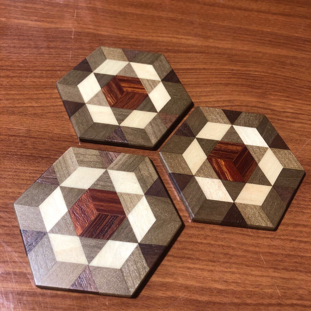 - 〈送料無料〉寄木細工 箱根細工 コースター 茶托 無垢 六角形 天然木 工芸品 箱根みやげ