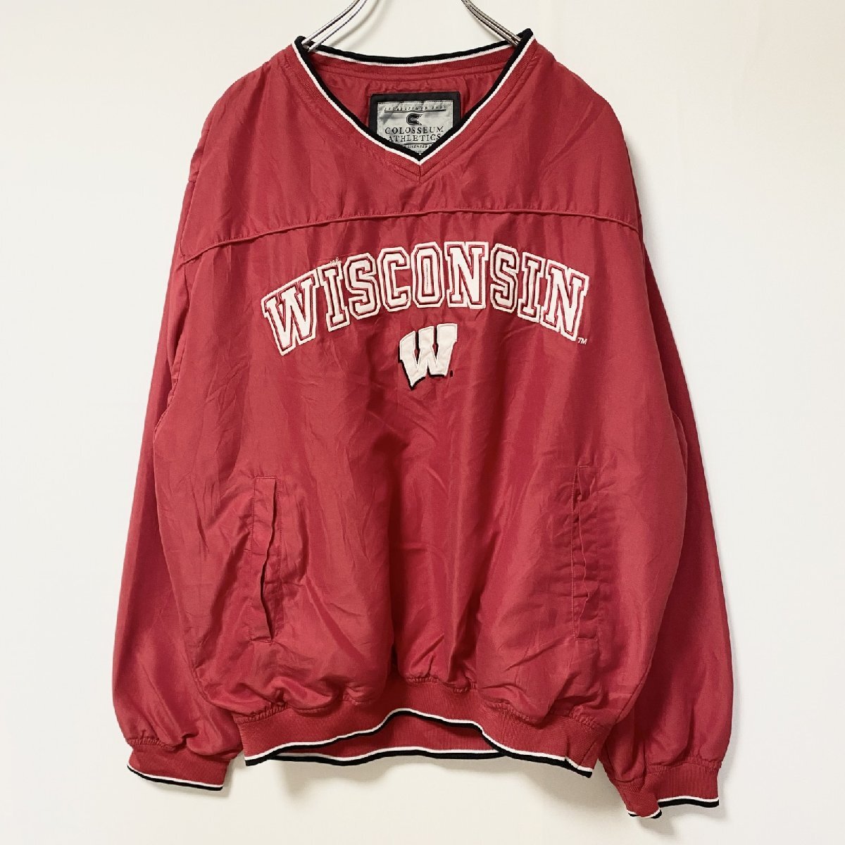 - 古着 used ウィスコンシン大学 長袖カレッジ刺繍ナイロンプルオーバー ウインドブレーカー Vネック レトロ 赤 Mサイズ