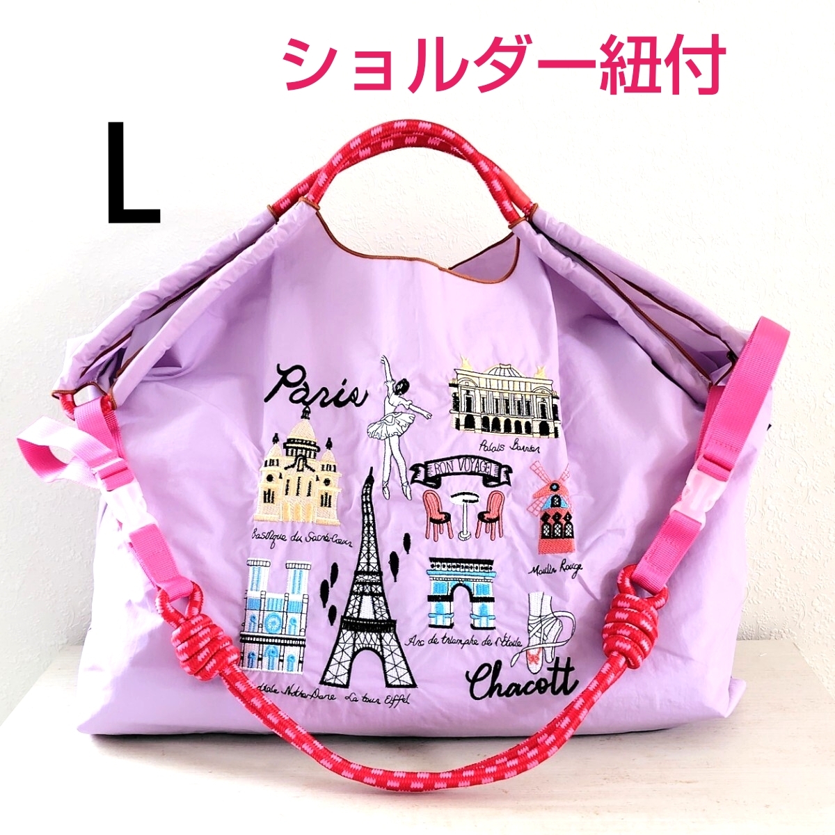 - L パリ チャコット 刺繍 エコバッグ ストラップ付き ラベンダー パープル ピンク ショルダー