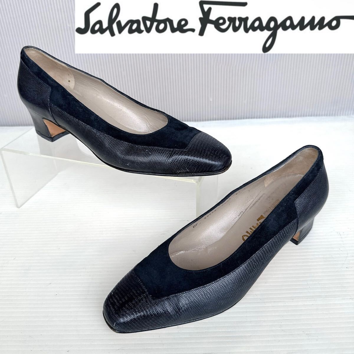 - Salvatore Ferragamo サルヴァトーレフェラガモ 太ヒール パンプス ローヒール サンダル シューズ ミュール レザー 黒 靴 レーディス 5.5C