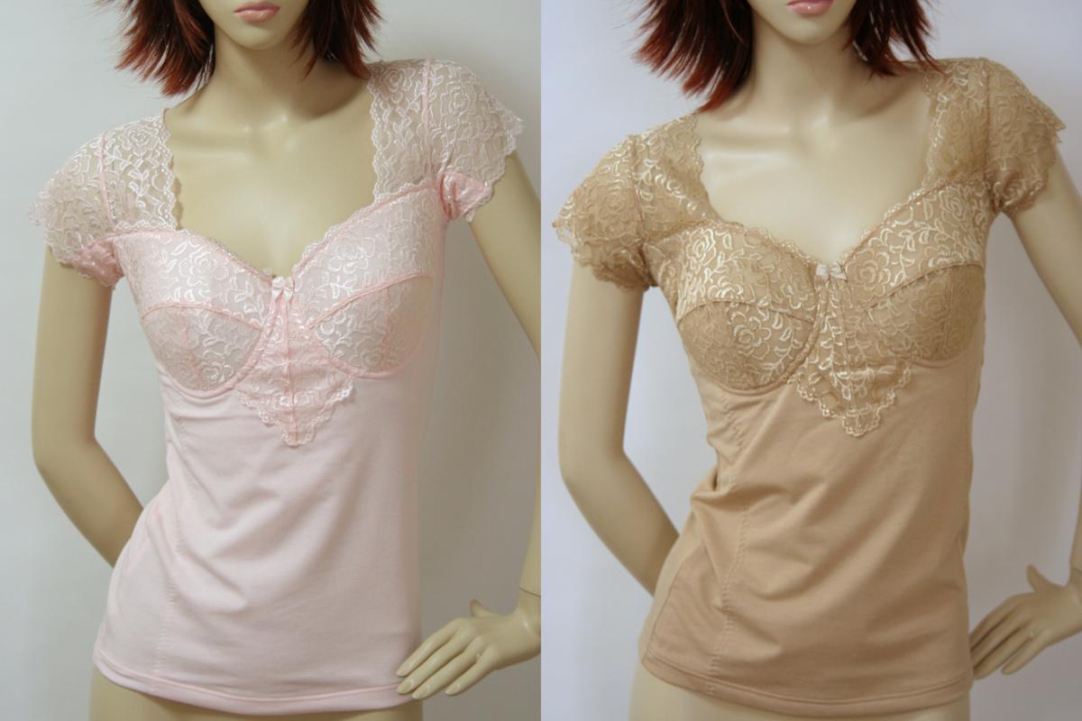 > 送料無料◆2色組◆脇汗ガード機能◆綿混素材◆お腹押さえ効果◆ノンワイヤー◆ソフトカップ付き◆フレンチ袖インナー(M/ピンク&ベージュ)