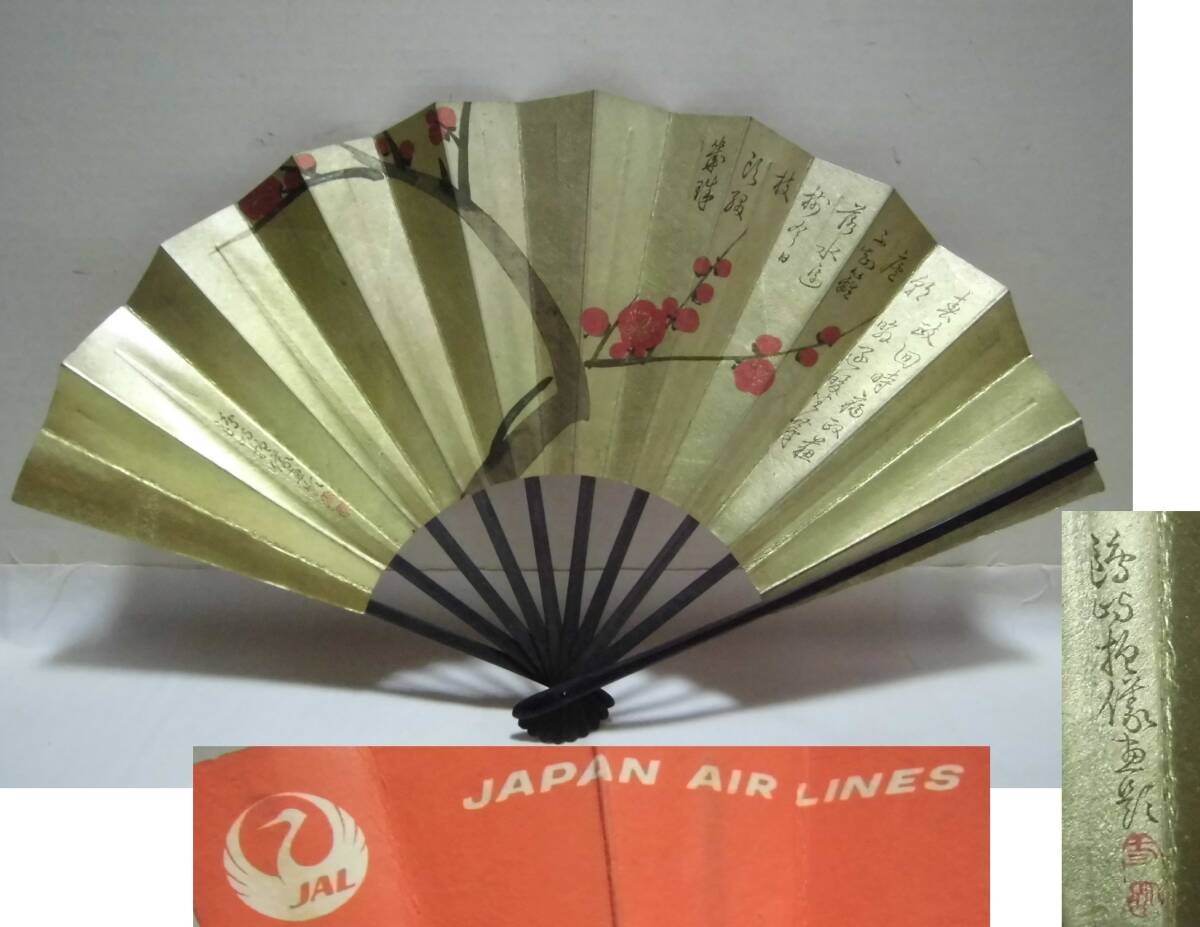 - 古い 扇子 日本航空 JAL 梅柄 金 竹製 置物 飾り物 ファション小物 工芸品 レトロ