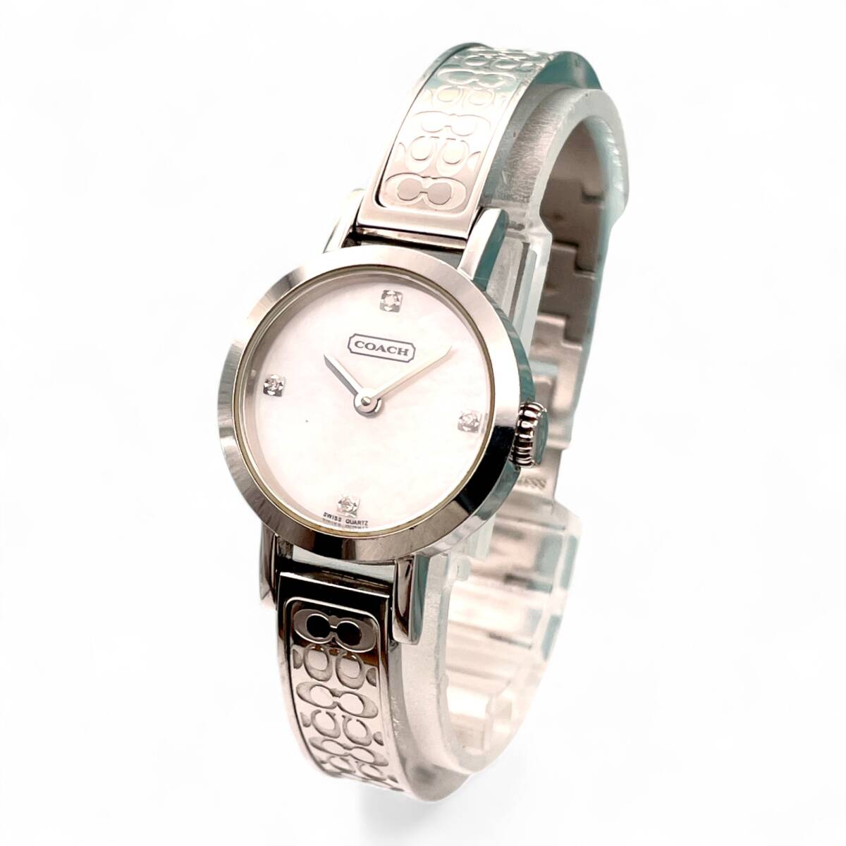 - 美品 ■ 稼働 COACH コーチ レディース 腕時計 8.006.530 シグネチャー シェル文字盤 ダイヤインデックス ラウンド シルバー 4810-54-18