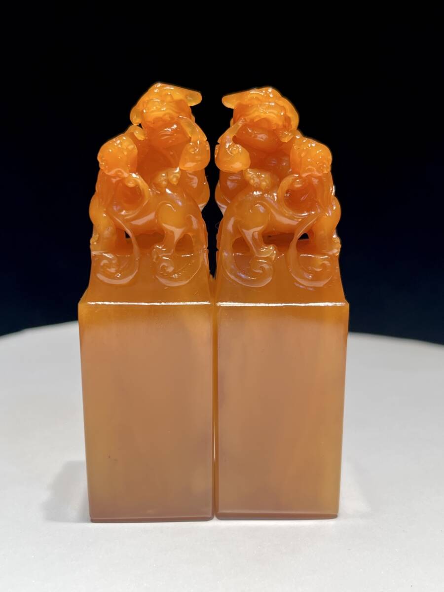 - ◆珍蔵◆中国古美術 清代 古寿山石 田黄石彫り古獸對章 精品 細密細工造 置物 擺件 古賞物 時代物 A68