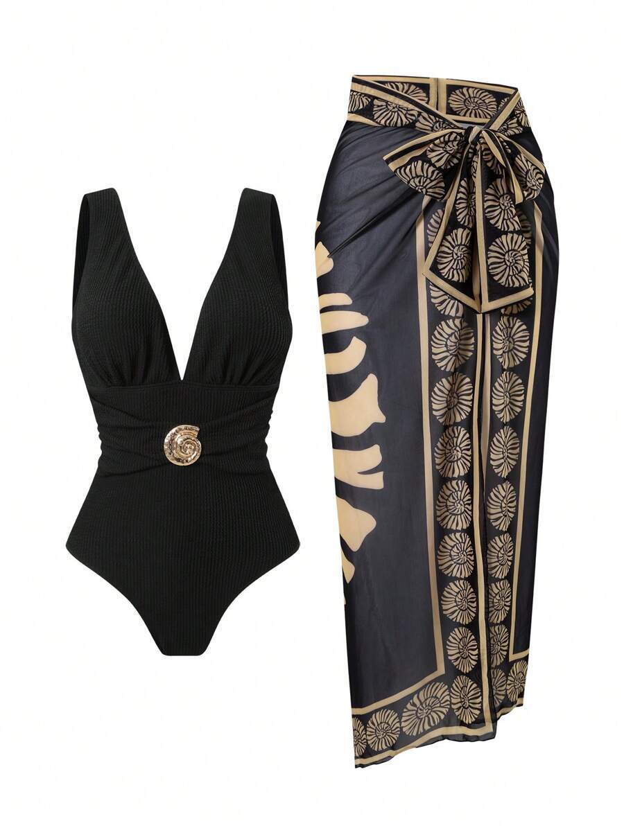- レディース 水着 ワンピース 2枚セット 女性用 2025年新作 黒 特殊素材 水着、メッシュ プリント ビーチカバーアップスカー