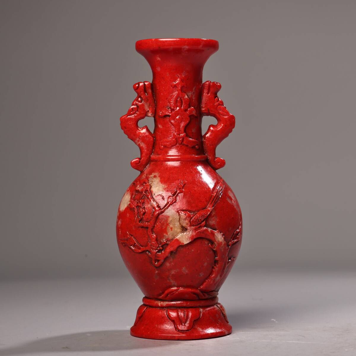 - 蔵友旧蔵出 寿山石 鶏血石 大紅袍 細密彫 喜鵲登梅紋 花瓶印章 盒付 文房具 文案置物 書道品 稀少物品 置物 賞物 中国時代美術品
