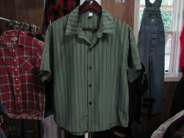 - ストライプシャッツ 緑 グリーン 半袖 カジュアル ガレージワークウエア