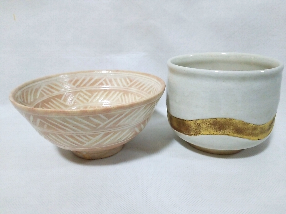 - ★【一美堂】★茶道具★花光山窯造★『抹茶碗2客』★三島手と金帯★