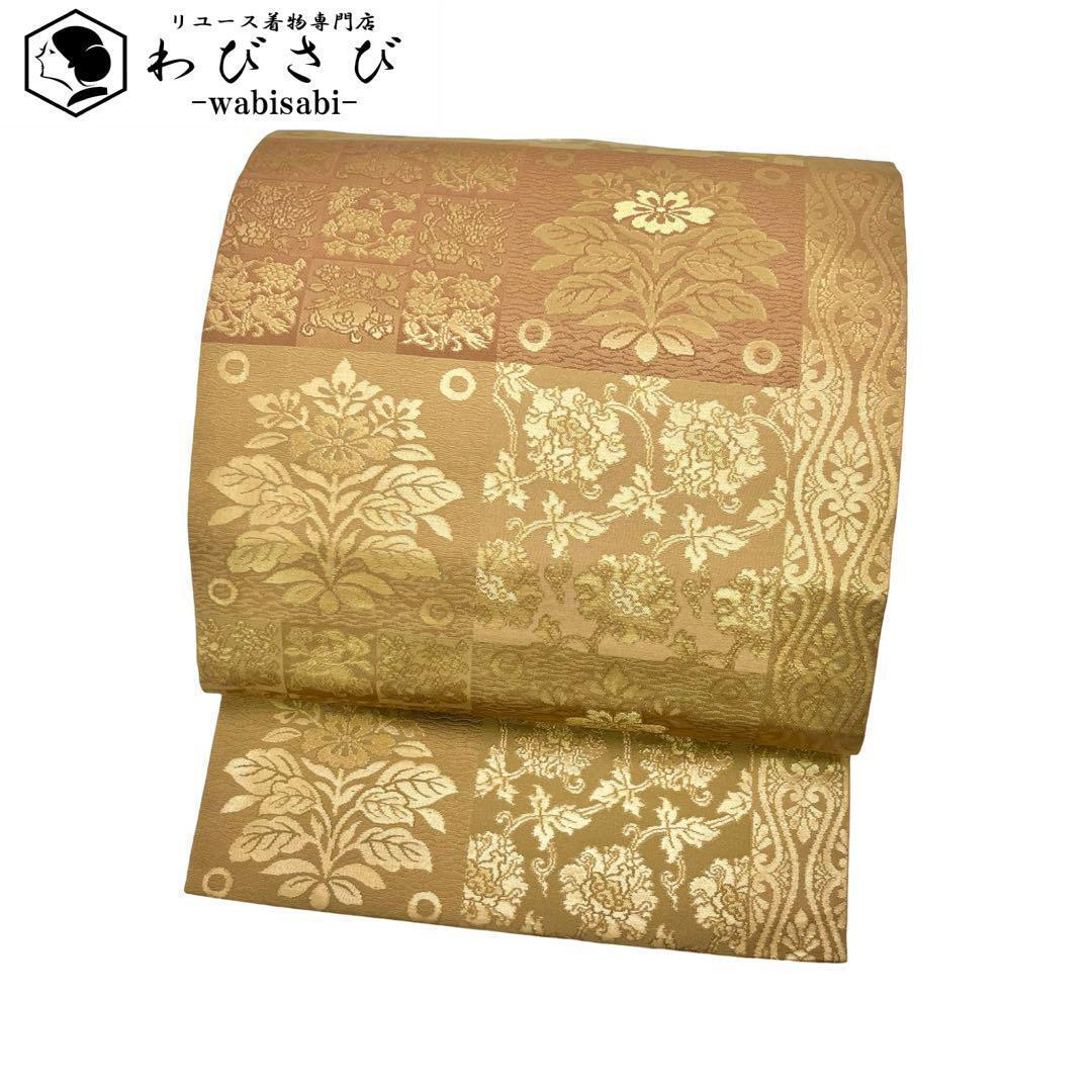- 名古屋帯 花唐草模様 格子柄 金茶色 金糸 O-4114 着物 きもの kimono 和服 和装 中古 リサイクル着物 【送料無料】