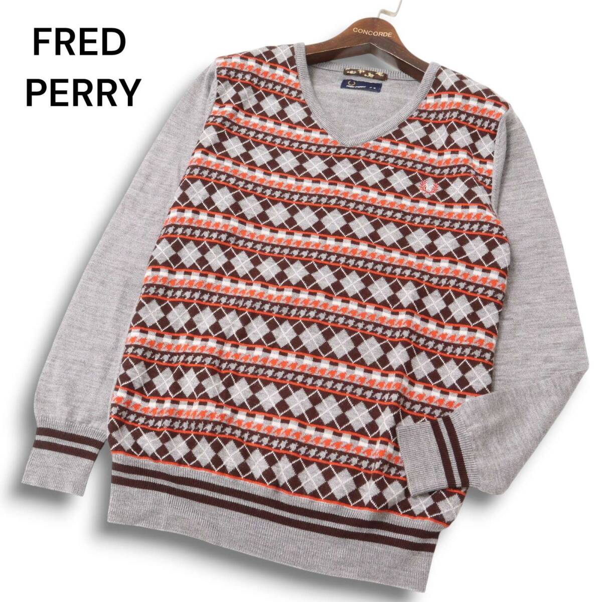 > FRED PERRY フレッドペリー 秋冬 ウール混★ アーガイル柄 セーター Vネック ニット Sz.M メンズ 灰 グレー