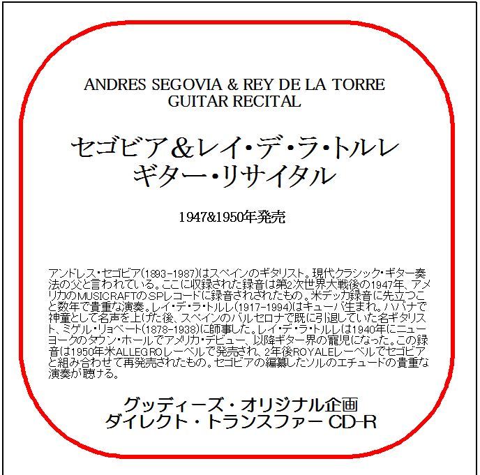 - セゴビア&レイ・デ・ラ・トルレ/ギター・リサイタル/送料無料/ダイレクト・トランスファー CD-R