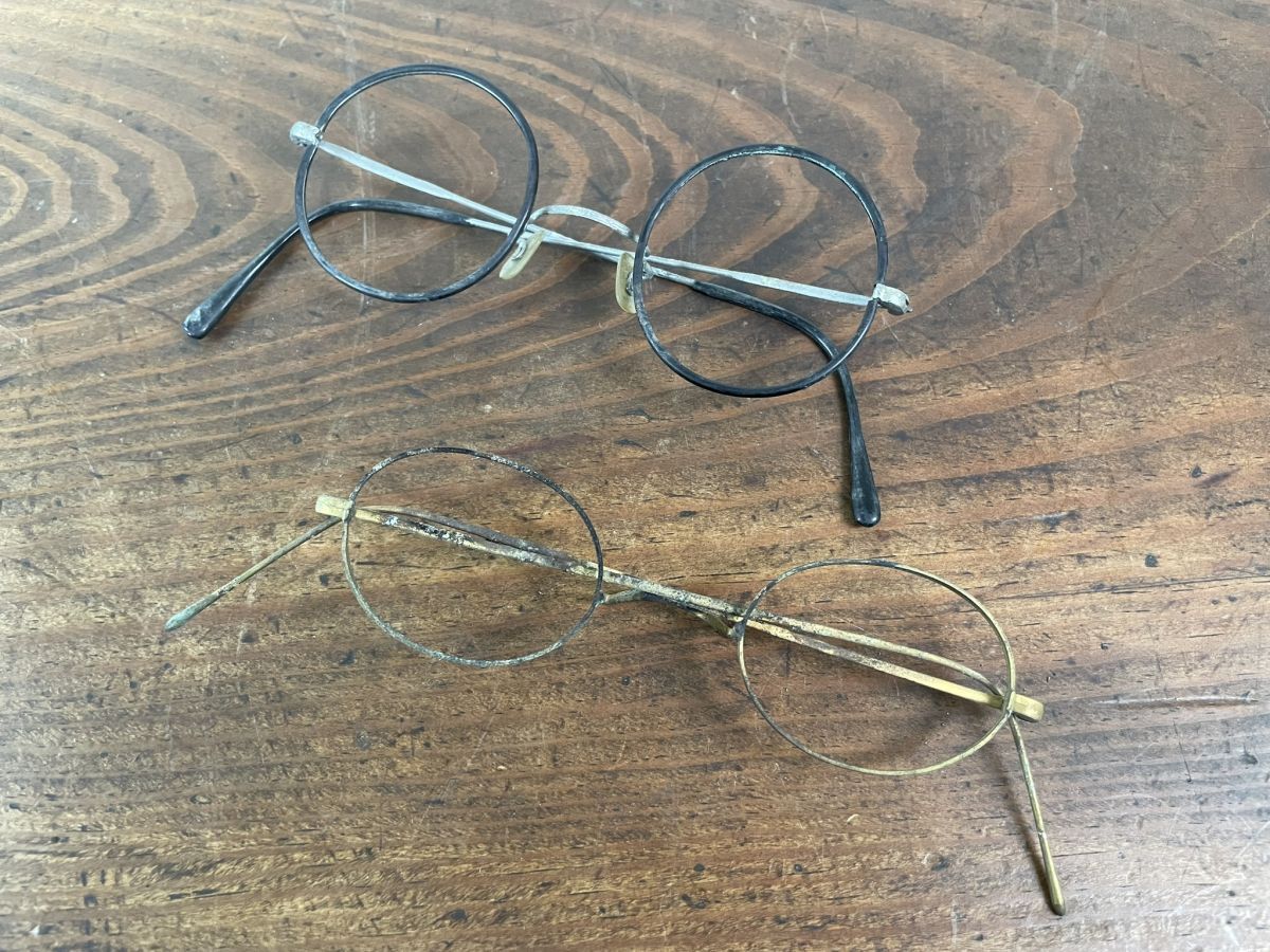 - A521 メガネフレーム2点 金色 銀黒色 巻きつるテンプル 丸眼鏡 メガネ 大正 昭和 レトロ アンティーク ヴィンテージ レンズなし