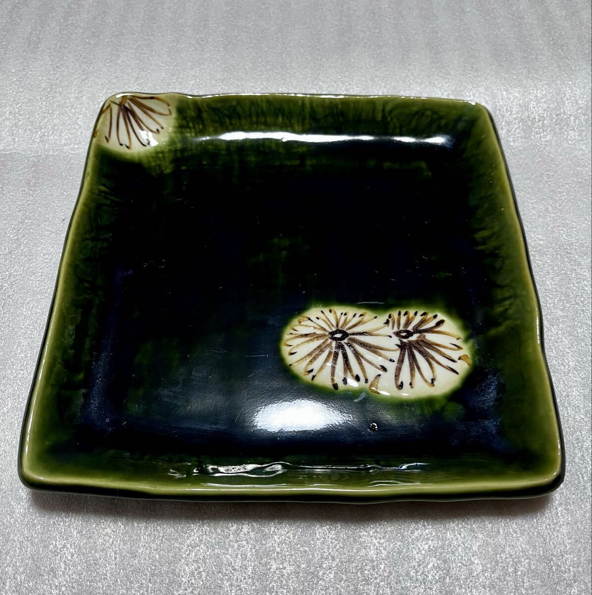 - 未使用 瀬戸赤津焼 織部 六兵衛窯 加藤六兵衛 共箱 瀬戸焼 赤津焼 角皿 花 手描き 裏印 和食器 陶磁器 織部釉 時代物 希少