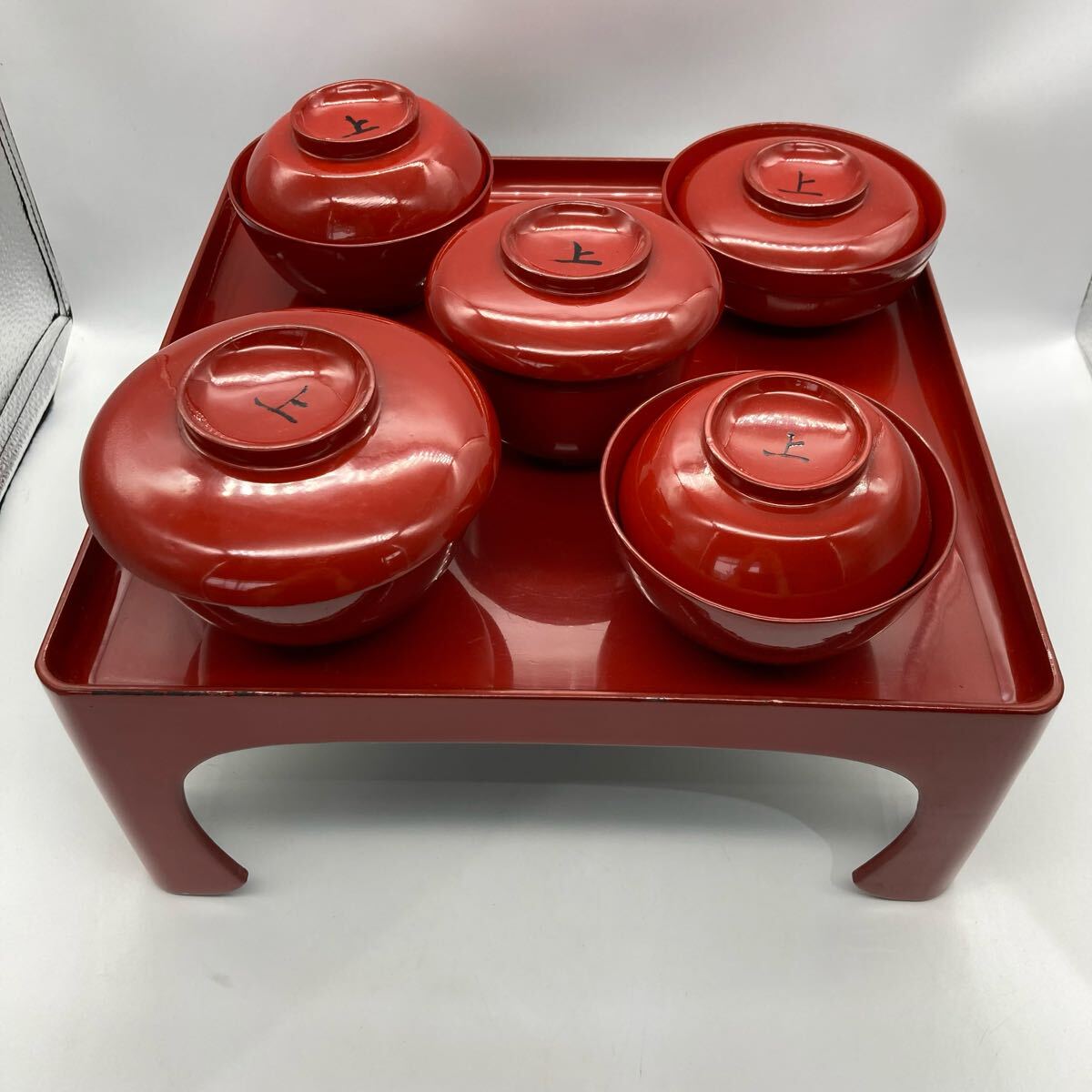 - M0913708N 御前茶碗セット 漆器 お膳セット 朱漆 昭和レトロ お祝い 膳 お椀 汁椀 煮物椀 うるし 伝統工芸品 当時物 中古品 現状品