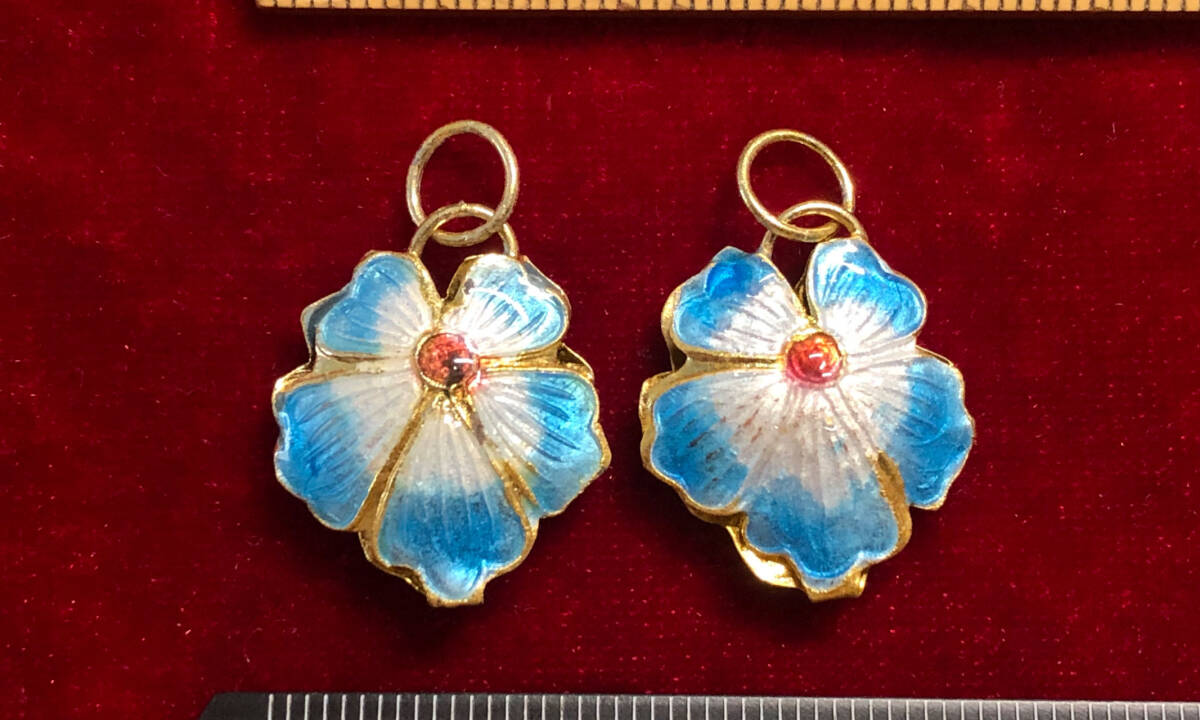 - ¶!¶ 有線七宝焼ワールド - 2個の五弁花型ペンダント ¶!¶ 約厚6㎜×18㎜×20㎜ 金線に水白色釉 手作り 手芸 工芸 インテリア ペンダント