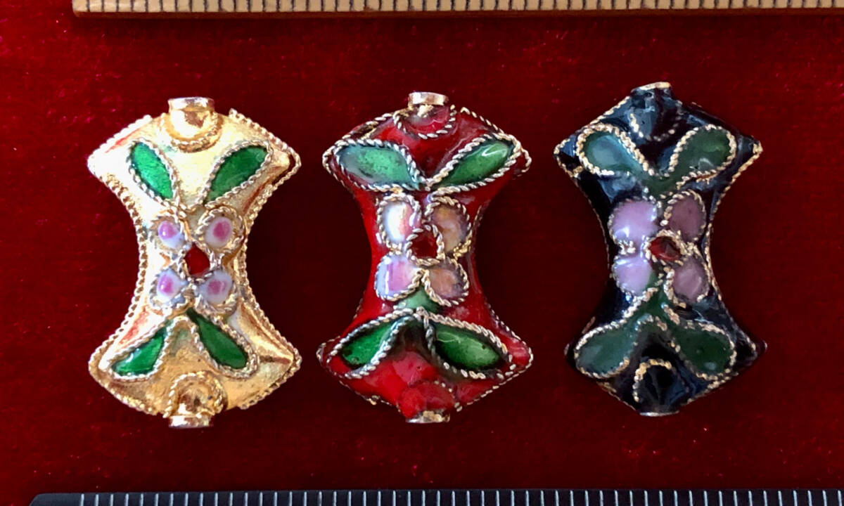 - ¶!¶ 有線七宝焼ワールド - 3色(個)の双扇型ペンダントd ¶!¶ 約厚6㎜×14㎜×21㎜ 金線に三色釉 手作 手芸 工芸 インテリア ペンダント