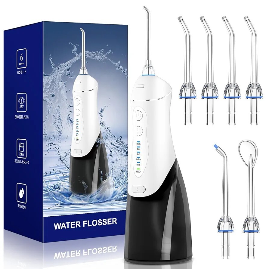 - 口腔洗浄器 ジェットウォッシャー 5種類の水流モード 替えノズル6本 360°回転設計 350ML USB充電式 コードレス 歯間ケア 口腔ケア