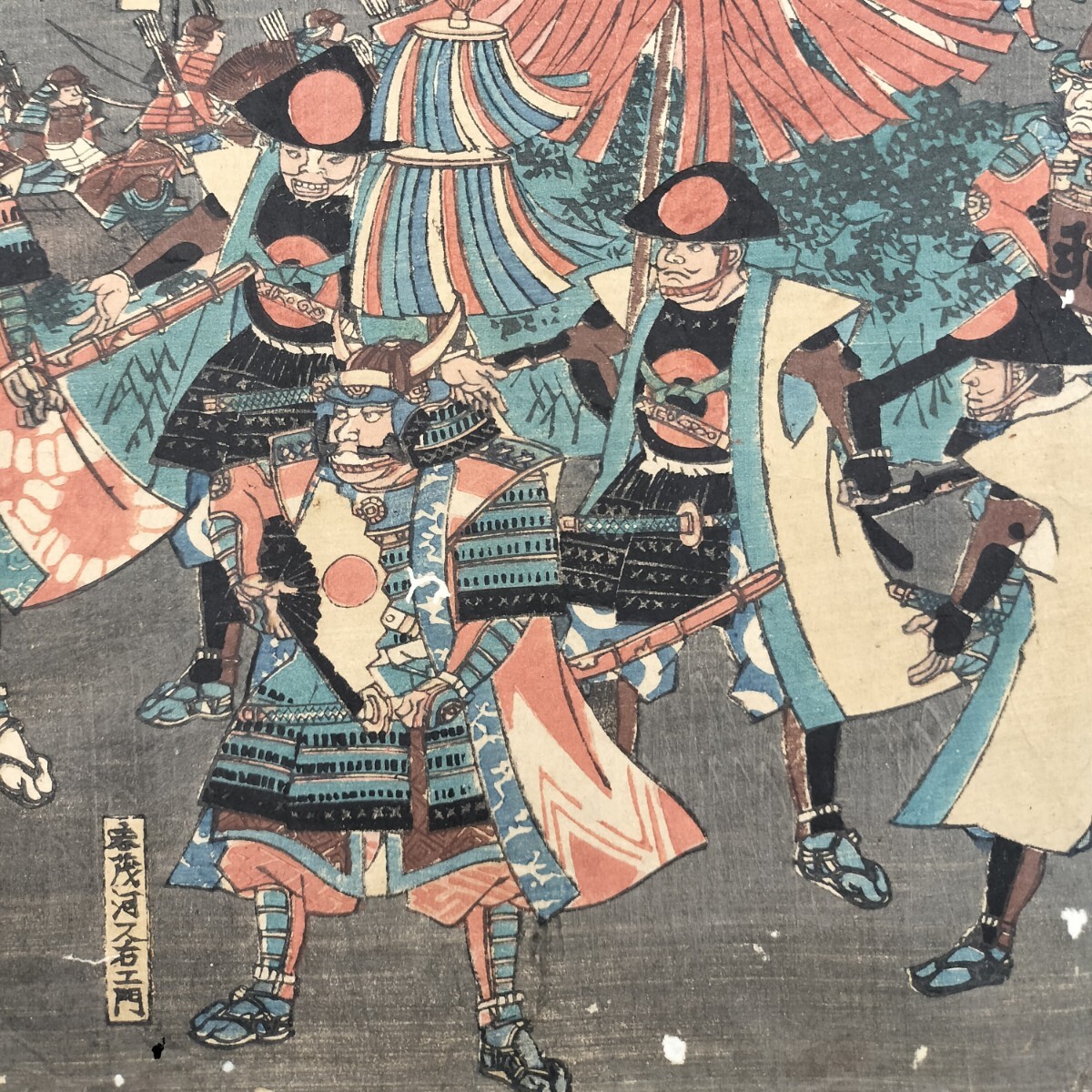- 江戸期/真作 歌川芳虎「佐藤肥後守従四位〜」本物浮世絵木版画 武者絵 戦争絵 合戦絵 錦絵 大判 裏打ち