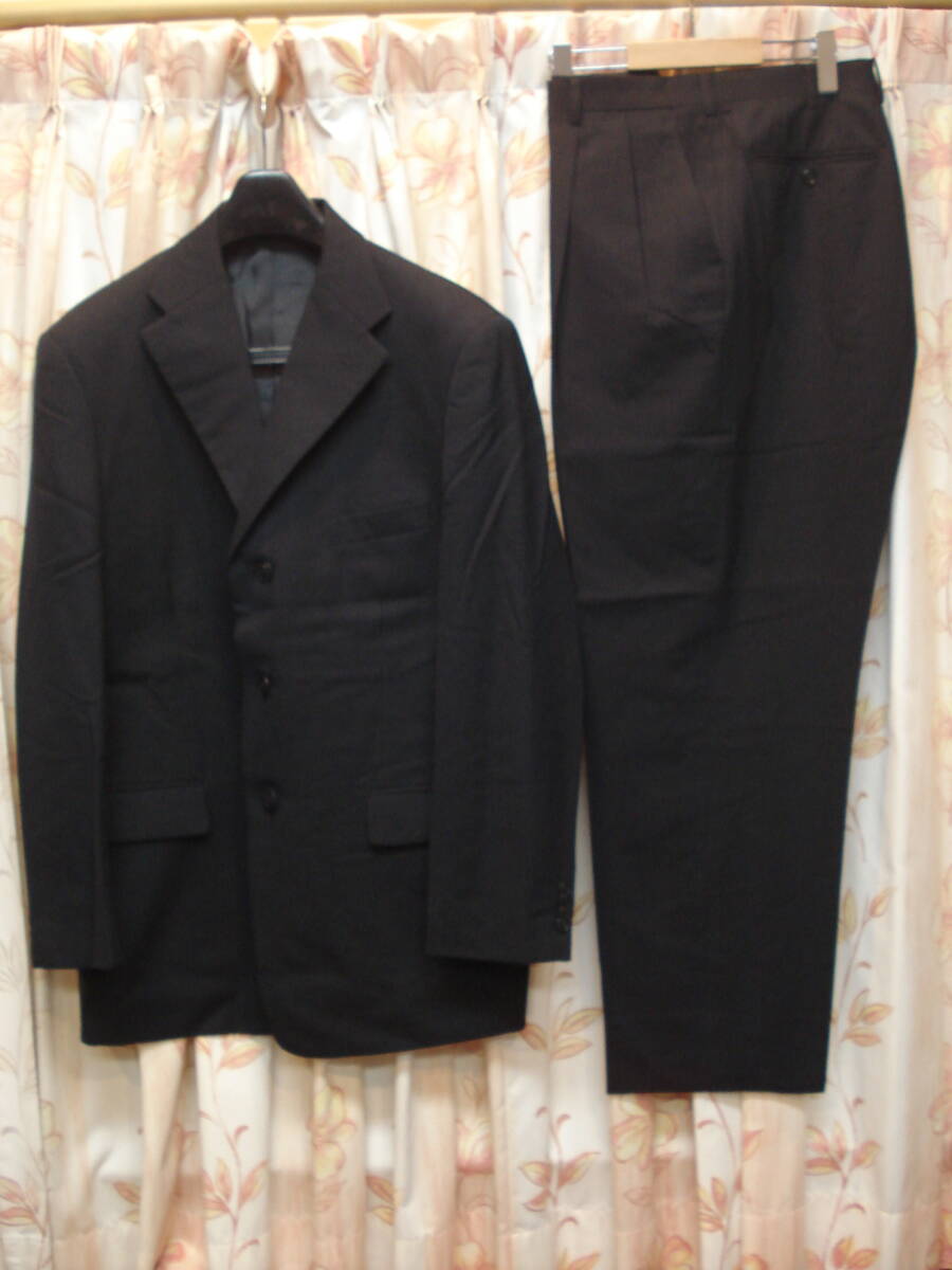 > 送料無料!美品!秋・冬もの!大きな人用!BB8サイズ!ウェスト:88cm!黒色薄い同系統色ストライプ柄入!毛:100%!定番シングルスーツ!