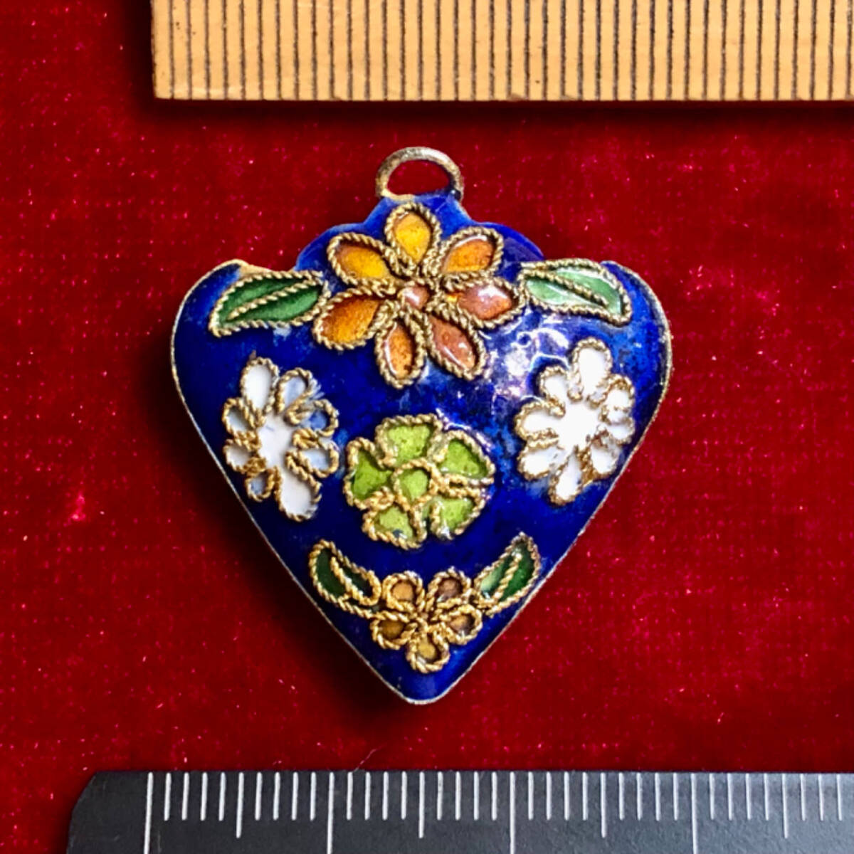 - ¶!¶ 有線七宝焼ワールド - 1個の超大ハート型ペンダント ¶!¶ 約厚10㎜×横28㎜×縦30㎜ 金線に藍色釉爛漫花 手作 手芸 工芸 インテリア
