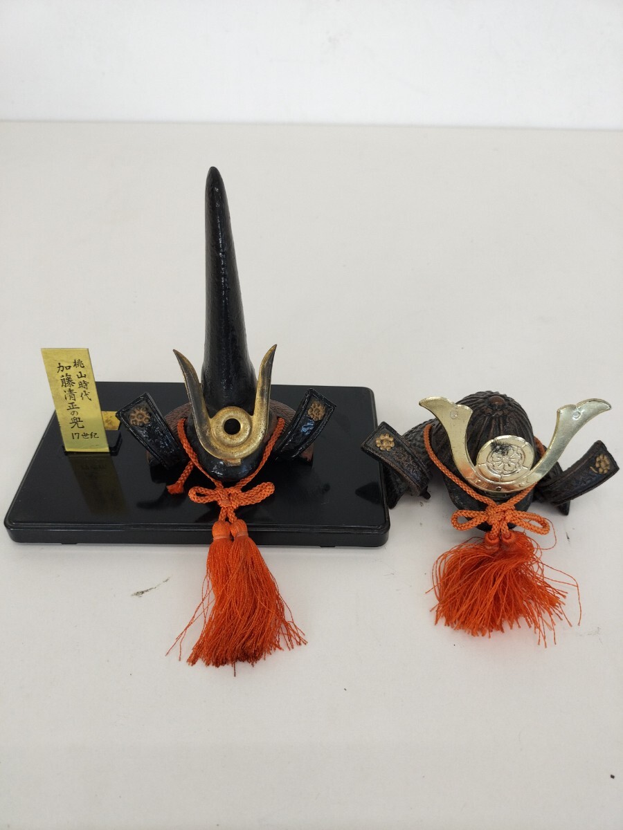 - 【25*90111】ミニチュア兜 加藤 清正 台付/ 織田 信長 金属製