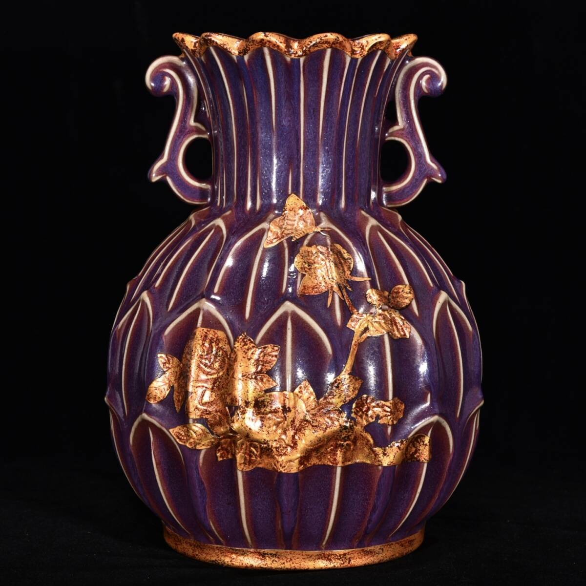 - 旧蔵 宋 鈞窯 バラ本紫釉 包口はめ込む金 蓮花雙耳罐 陶芸 古陶磁器 中国磁器 極細工 中国古玩 骨董品 古美味 209