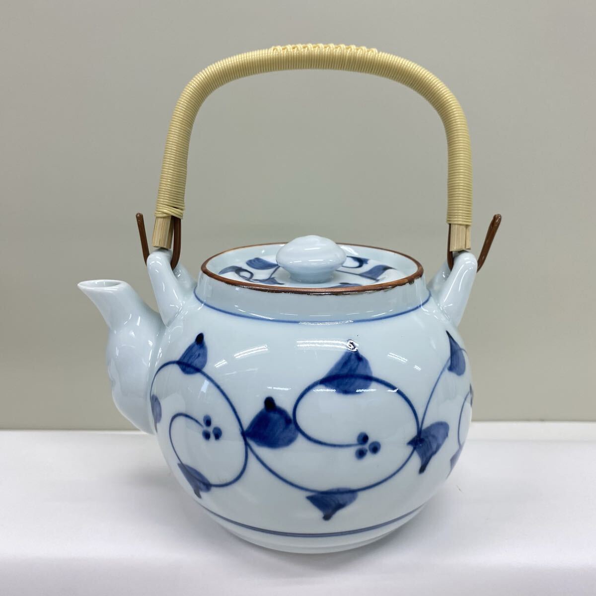 - 647 有田焼 急須 大きめ 染付 唐草模様 銘あり 土瓶 茶漉し付 茶器 ポット 茶道具 煎茶道具 和食器 横幅17.5cm