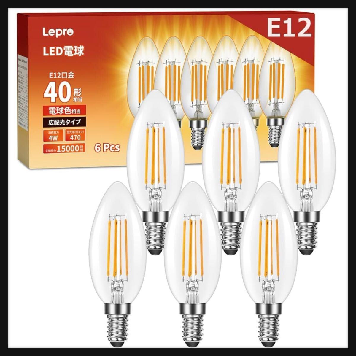 - 【開封のみ】Lepro【E12】Lepro LED シャンデリア電球 E12口金 6個 40W形 口金直径12mm C35 電球色 2700K フィラメント 280° レトロ
