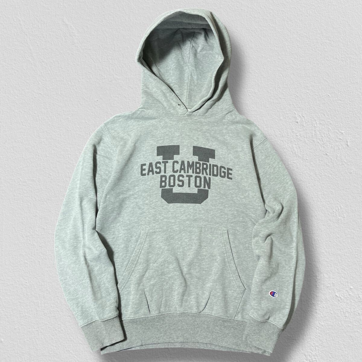 - Champion フーディーロゴパーカー EAST CAMBRIDGE BOSTON グレー M ●洗濯プレス済● チャンピオン スウェット トップス 古着/597