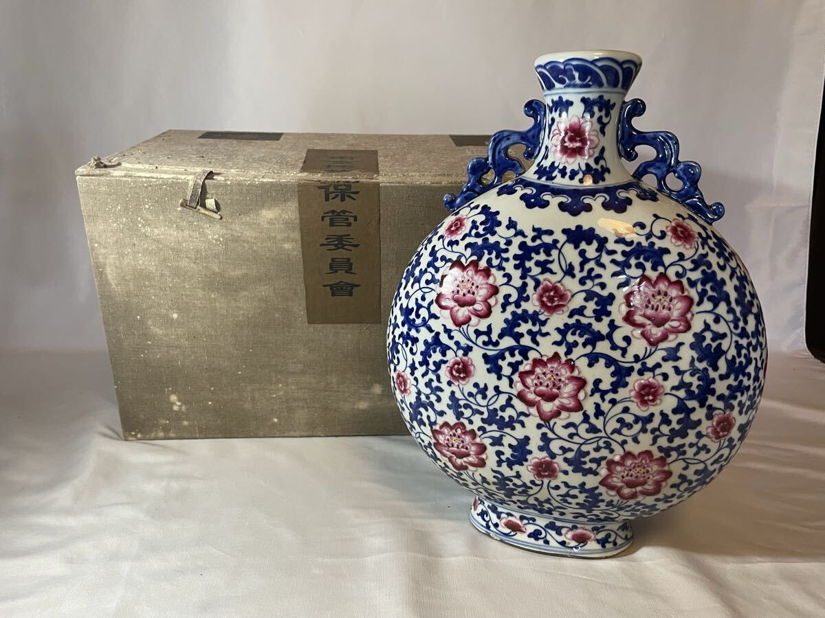 - 【故宮】染付釉裏紅纏枝連紋扁壺 H36-W28 楕円形 南京博物院保管委員会 清大乾隆年製 中国古玩 時代物 青花 置物 中国美術 染付中国古美術