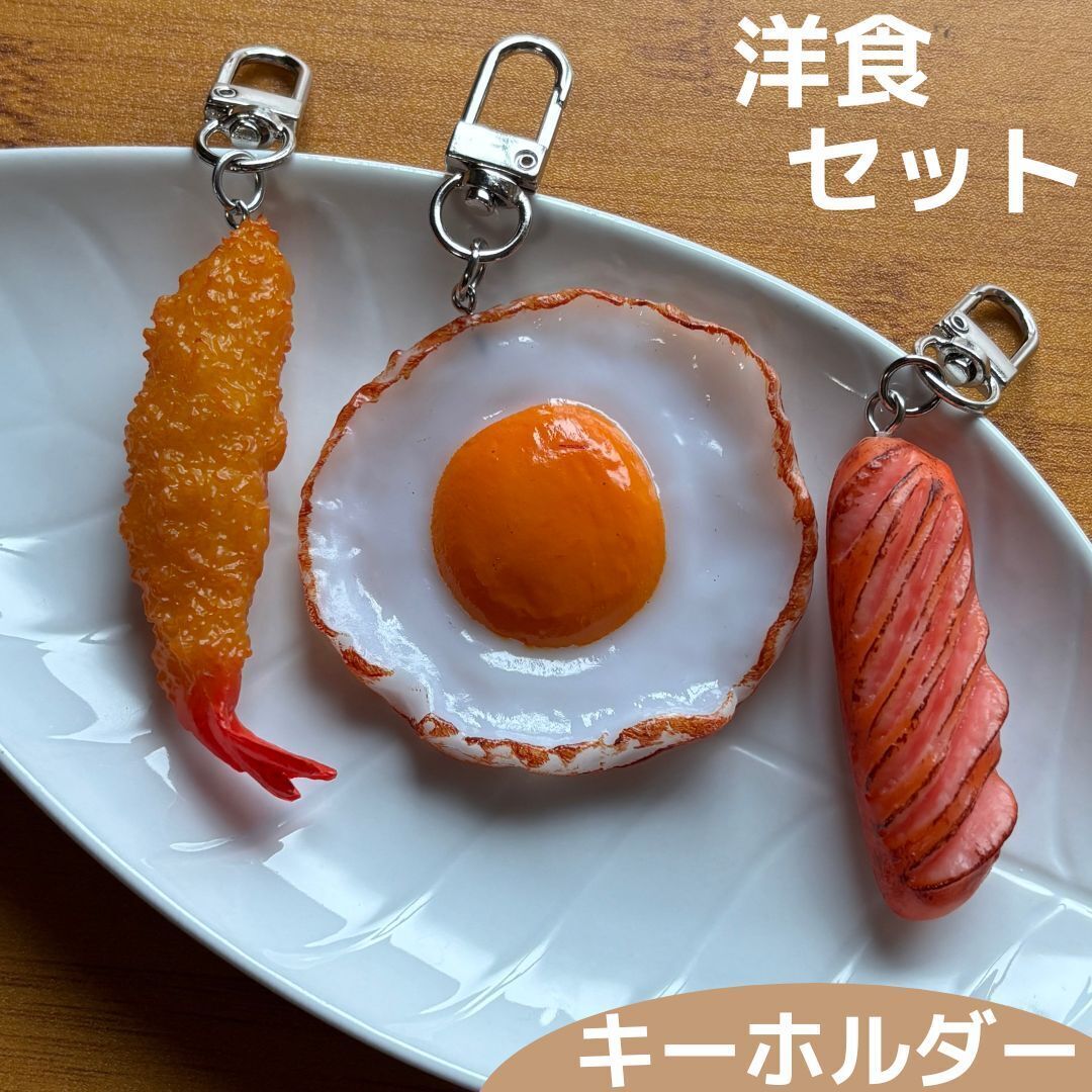 > 食品サンプル キーホルダー 洋食 3点セット エビフライ 目玉焼き ウインナー バッグ リュック ストラップ 海老 タマゴ 卵 玉子 ソーセージ