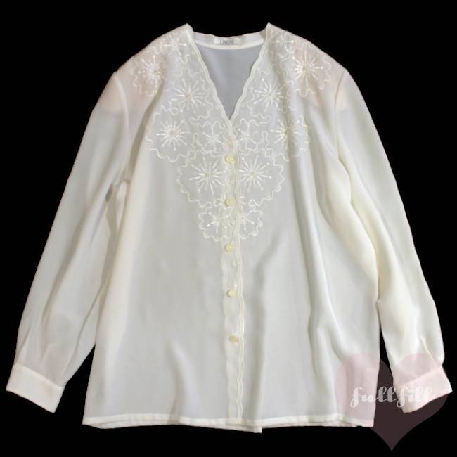 - 古着 ブラウス ホワイト 白 刺繍 ビーズ 昭和 レトロ ビンテージ ヴィンテージ vintage レース フォーマル 長袖 レディース古着 used