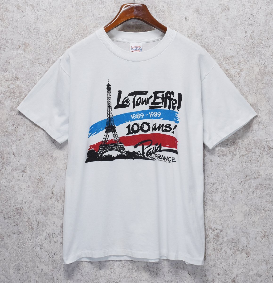 > 80's~ USA製 ビンテージ La Tour Fiffel PARIS FRANCE フランス エッフェル塔 白 プリント Tシャツ L EG2509-3-EG28 検 hanes オニータ