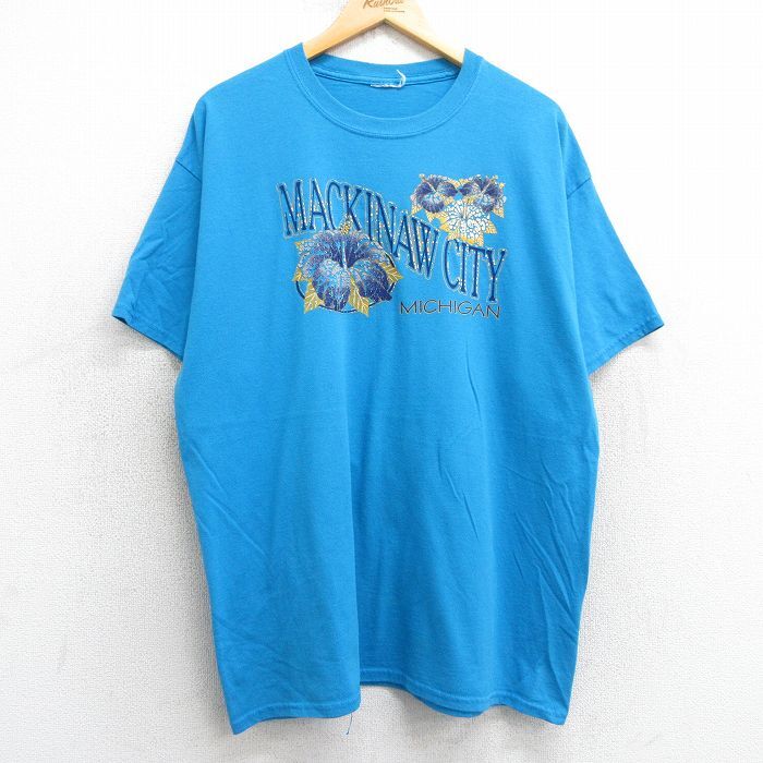 - XL/古着 半袖 ビンテージ Tシャツ メンズ 00s ハイビスカス マッキノーシティ ミシガン クルーネック 水色 25may07 中古