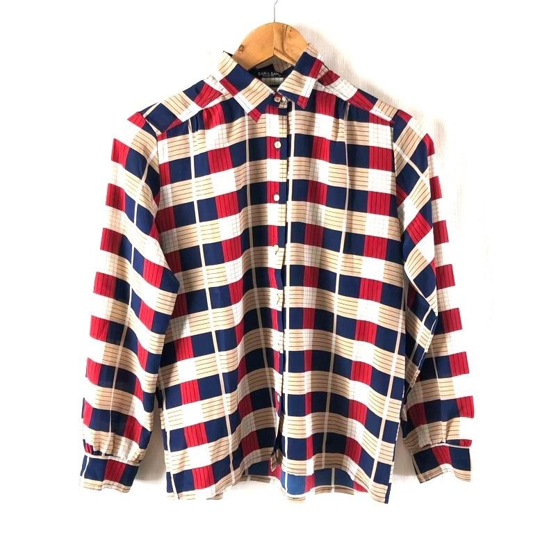 - BAN & BAN シャツ 長袖 リボン付き チェック ボタン ネイビー 赤 白 ベージュ 9サイズ 2025082900206