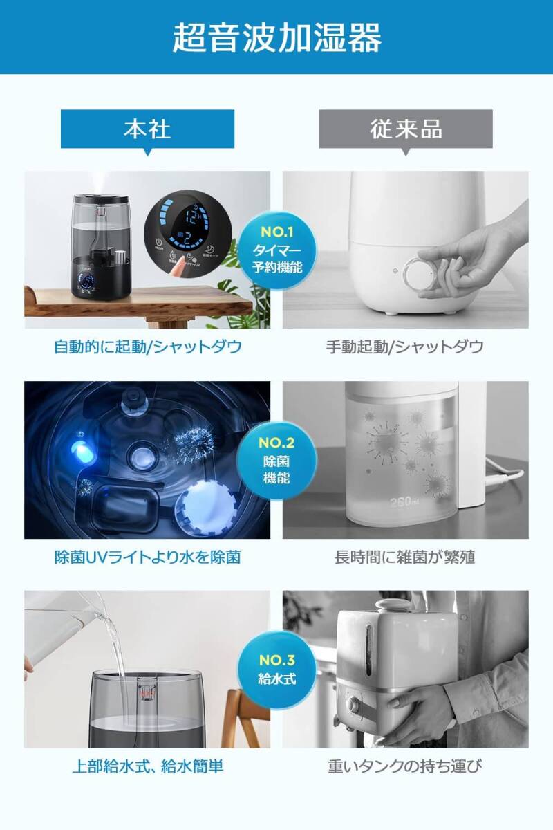 - タイマー機能付き大容量加湿器 UV除菌 静音設計 三段階霧量調整