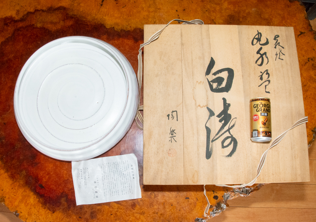 - 萩焼 梅田陶楽 白釉 丸型 水盤 在銘 共箱 美品 花器 茶道具 華道 いけばな