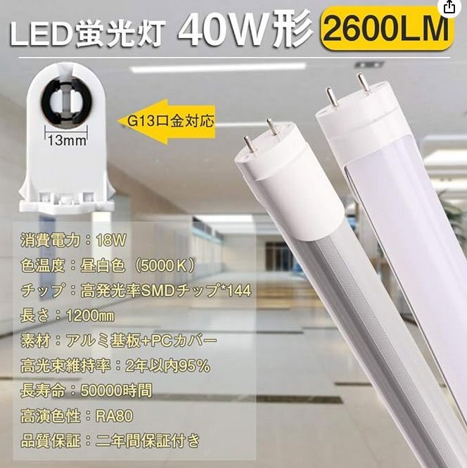 - ★未使用★LED蛍光灯 40W形 2600lm 消費電力18W 昼白色5000K T8直管 120cm 1198mm G13口金 グロー式工事不要 #09Z1596a66