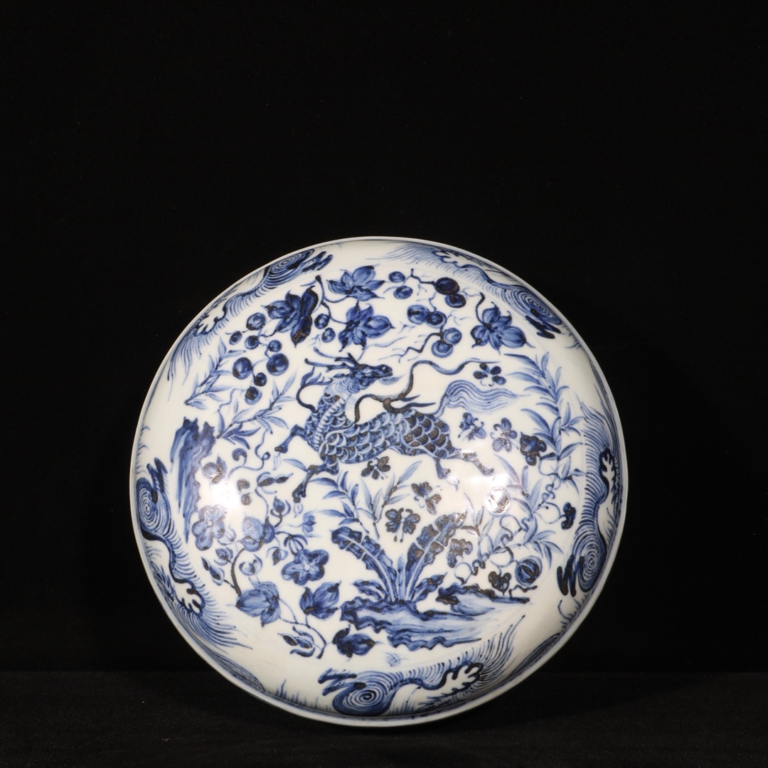 - 元青花 染付 麒麟文合子 唐物 箱付き 陶磁器 中国美術 古美術 置物 高さ10cm 直径20cm RG596